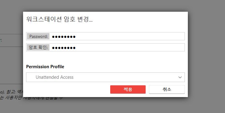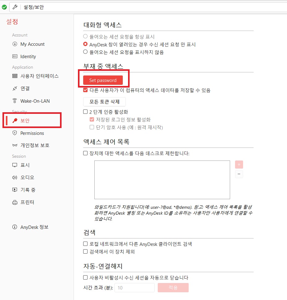 설정 화면에서 “보안” 화면으로 이동 후, “Set password” 버튼을 클릭 후 비밀번호를 설정해 주시면 됩니다. 그러면 원격 대상 컴퓨터에 접근 필요시 “승인” 없이 비밀번호 입력을 통해 접근할 수 있습니다.
