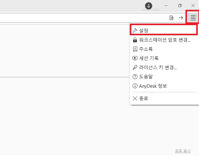 비밀번호 설정은 원격 접근 시 승인이 아닌, 비밀번호 입력을 통해 접근이 필요하실 때 사용하는 방법이니 상황에 맞게 사용하시면 됩니다. 그럼 애니데스크 원격을 받는 컴퓨터에서 애니데스크 실행 후 우측 상단에 있는 전체 메뉴 아이콘 클릭 후, “설정” 메뉴를 클릭해 주세요.