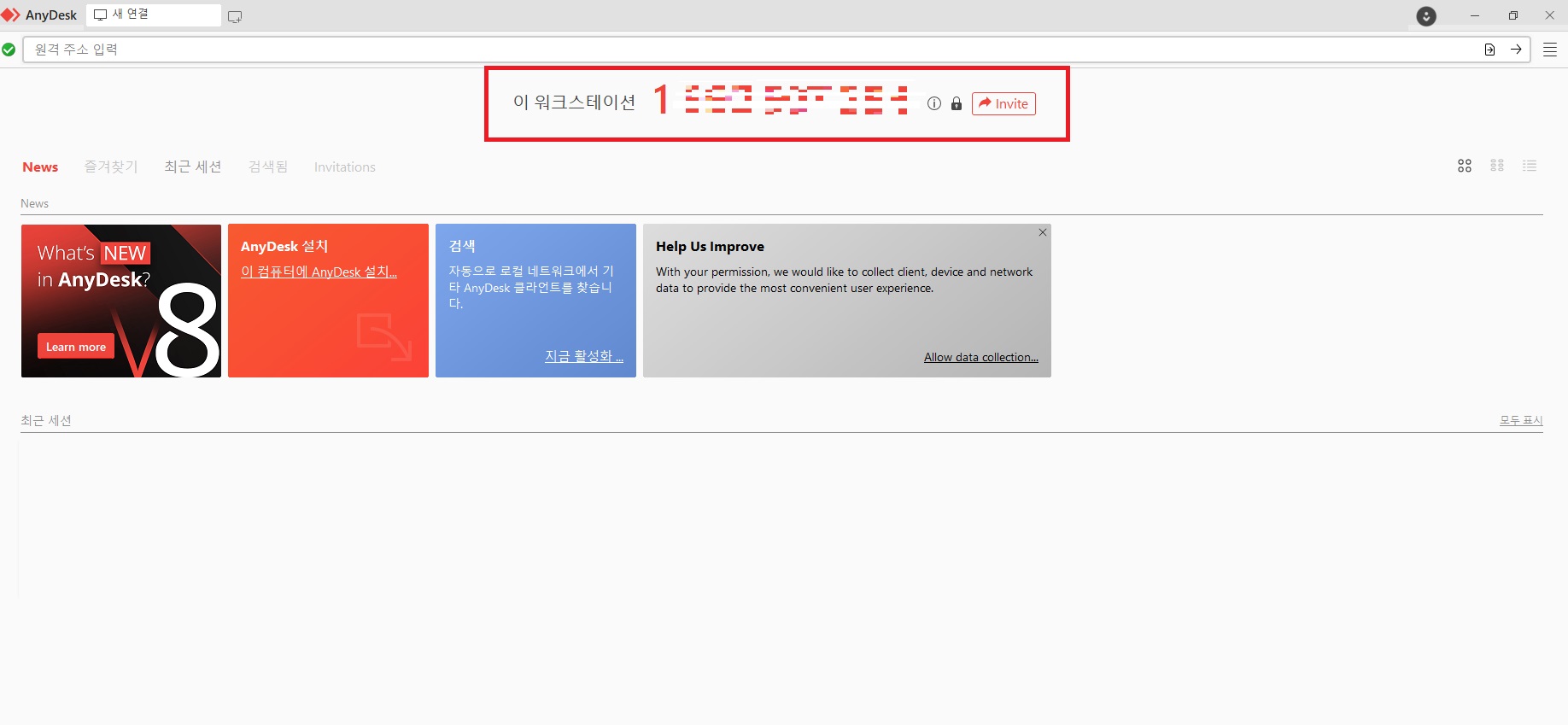 다운로드한 애니데스크 실행 파일을 실행해 주시면 아래 화면과 같이 애니데스크 화면이 출력됩니다. 여기서 상단에 출력되는 9 ~ 10자 숫자가 있는데요. 이 숫자가 바로 현재 컴퓨터의 원격 접속에 필요한 주소입니다. 중요한 부분이니 꼭 기억해 두세요.