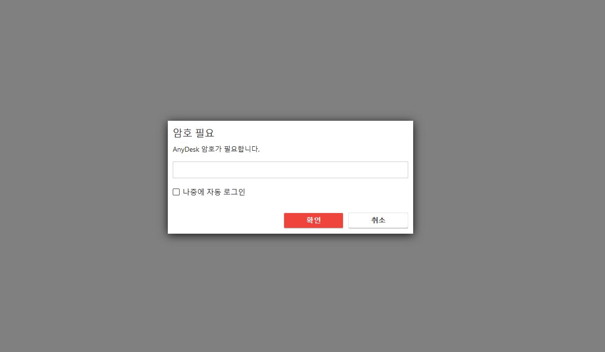 아래의 화면이 비밀번호 설정 후 애니데스크 원격을 하면 뜨는 접속 화면입니다. 보시는 것처럼 "승인" 안내창이 아닌 비밀번호 입력 창이 출력되는 것을 확인할 수 있습니다.