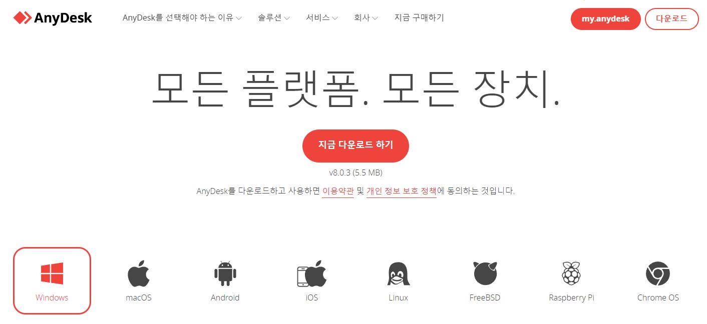 애니데스크 다운로드 시 현재 컴퓨터의 OS 버전을 클릭해 주시면 되는데요. Windows 사용하기 때문에 Windows 버전 클릭해서 실행 파일을 다운로드하겠습니다.