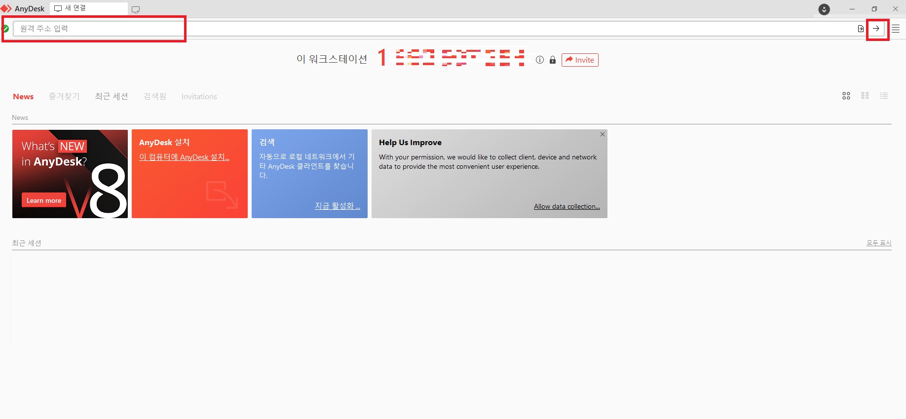원격을 거는 컴퓨터에서 원격을 받는 컴퓨터의 주소을 입력하세요. 원격 주소는 최상단 입력란에 입력 후 “Enter” 또는 우측에 “→” 연결 아이콘을 클릭하시면 됩니다.